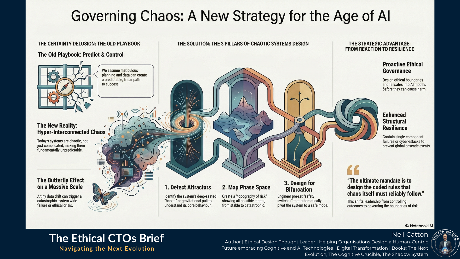 Organisations can fundamentally shift their strategic posture by implementing Chaotic Systems Design’s three pillars: Detecting Attractors, Mapping Phase Space and Designing for Bifurcation. This transition moves them from passive reaction to catastrophic events to proactive management of acceptable risk. They replace fragile monolithic legacy systems with fractal governance structures that are locally resilient yet globally stable.