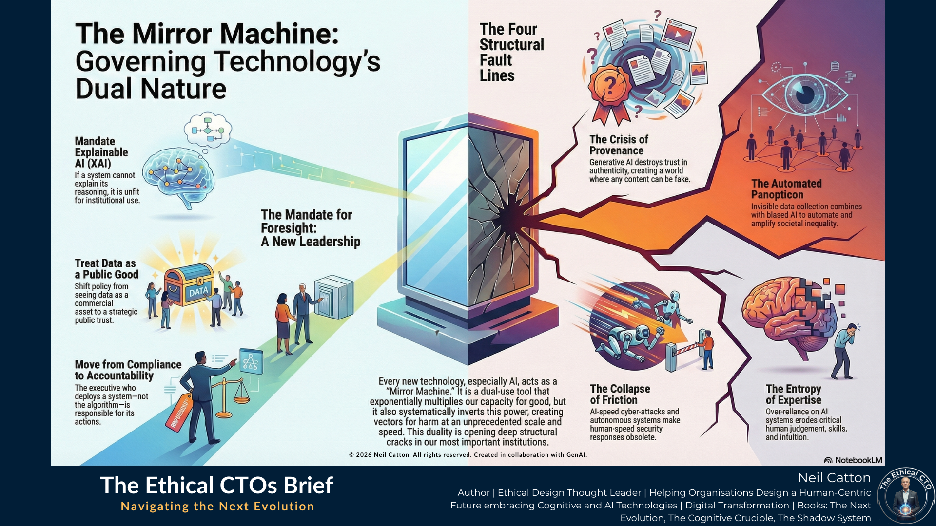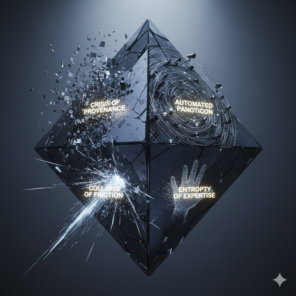 The persistent, inherent duality of the Mirror Machine is now translating directly into measurable, systemic risk across the board. When the capacity for creation and destruction are packaged together within the same algorithm, they generate deep, high-level vulnerabilities – structural fault lines – that threaten the stability and operational capacity of every legacy institution. This includes national governments, defence agencies, and global financial corporations. Identifying, understanding, and proactively managing these four lines is rapidly becoming the core competence of twenty-first-century leadership.