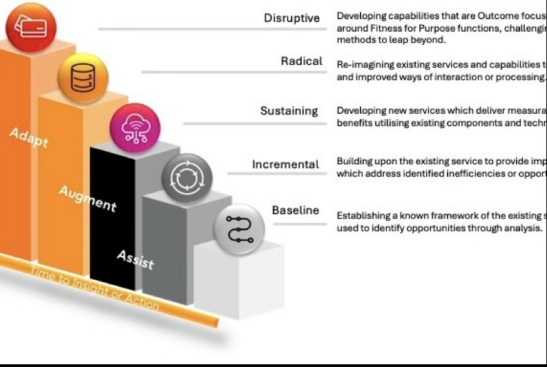 Organisations see Innovation as a “thing” when in fact it is a mindset of how to make changes that make a difference. The scale of the change needs to be consider to understand when, where, what, how and why value can be realised. I use a 5 layer model for describing innovation - level 1 is the Baseline where it’s reviewing the existing People, Process, and Technology landscape to identify simple candidates for change; Level 2 is Incremental change which builds upon existing capabilities to make them better; Level 3 is Sustaining where it’s about developing new services/capabilities using existing components and/or technologies; Level 4 is Radical and it’s about re-imagining services and capabilities to do them in totally different ways; and Level 5 Disruptive which is about challenging everything and implementing totally new ways of doing things.